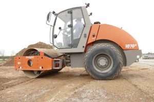 Präzise erarbeitet der Walzenzug die Verdichtung auf seinen Bahnen. Tiefgehende Verdichtung sind hier bei Regensburg notwendig, um einen 2.000 m² großen Stellplatz für Fahrzeuge anzulegen.
