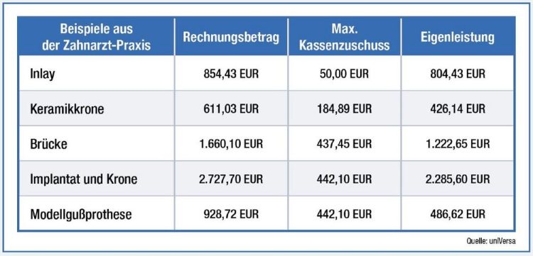 Die uniVersa hat zur Zahnzusatzversicherung eine neue Beratungshilfe herausgebracht. Darin sind verschiedene Kosten- und Leistungsbeispiele aus der täglichen Regulierungspraxis anschaulich dargestellt. So wird gezeigt, was ein Inlay, Implantat oder eine Keramikkrone, Brücke und Modellgussprothese kosten kann, wie viel davon die Kasse an Festzuschuss übernimmt und wie hoch der Eigenanteil des Patienten liegt. Bei einem Implantat mit einer Krone liegen die Gesamtkosten für chirurgische und prothetische Maßnahmen zum Beispiel bei 2.727 Euro. Davon übernimmt der uniVersa-Zusatztarif uni-dent|Privat zusammen mit der Kassenleistung je nach geführtem Bonusheft zwischen 80 und 90 Prozent. Auch dies ist übersichtlich und transparent dargestellt. Als Besonderheit kann der Tarif ohne Gesundheitsfragen abgeschlossen werden und leistet auch für professionelle Zahnreinigung und Zahnprophylaxe bis zu 75 Euro pro Kalenderjahr. Die neue Beratungshilfe „Beispiele aus der Zahnarzt-Praxis“ ist als PDF-Download unter www.universa.de/dent abrufbar.