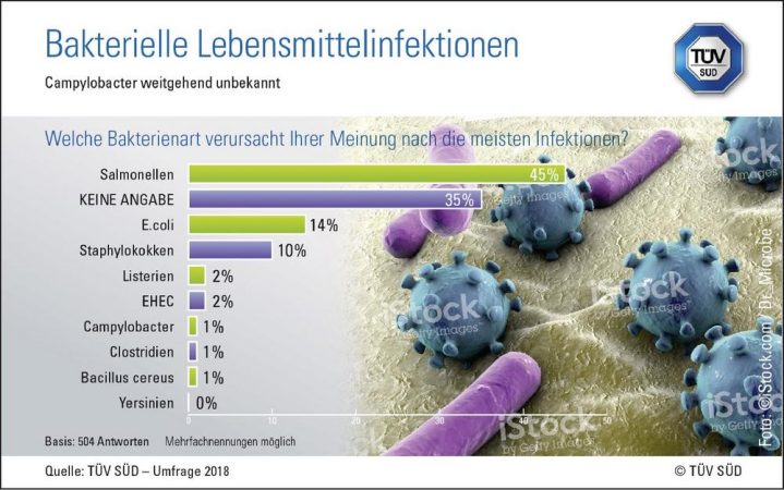Im Jahr 2016 wurden in Deutschland 73.999 Erkrankungen an Campylobacter-Enteritis gemeldet, gegenüber 12.962 Salmonellen-Erkrankungen. Bakterielle Erreger der Gattung Campylobacter sind weltweit verbreitet, ansteckend und laut Infektionsschutzgesetz meldepflichtig. Infektionen mit Campylobacter äußern sich vor allem in Durchfallerkrankungen, starken Bauchschmerzen und Fieber. Sie sind in Deutschland die häufigste Ursache bakterieller Darminfektionen. „Doch das Wissen über den häufigsten Erreger von Lebensmittelinfektionen ist in der Bevölkerung nicht sehr ausgeprägt“, sagt Dr. Andreas Daxenberger, Lebensmittelexperte bei TÜV SÜD. In einer Umfrage zur Bekanntheit von Infektionserregern in Lebensmitteln überraschte Campylobacter mit einer Unbekanntheit von 64 Prozent. Die Salmonellen hingegen waren nur sieben Prozent der Bevölkerung unbekannt.