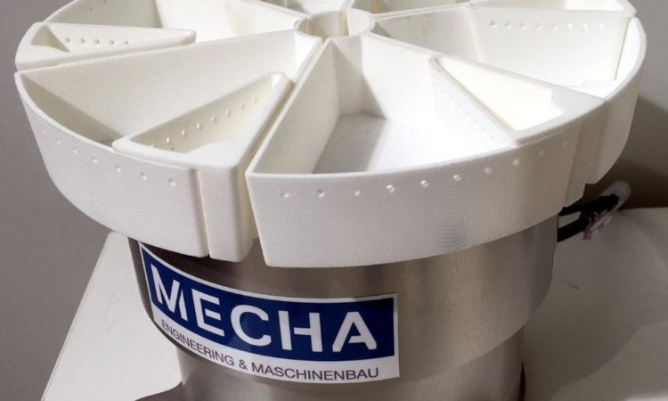 Für die Teileseparierung und SPC Kontrolle von Klein- und Mikroteilen, die auf Drehautomaten oder Stanzautomaten gefertigt werden, entwickelt die Fa. MECHA AG maschinelle Lösungen mit Steuerungstechnologie. Oft gehen Mikroteile beim Ausbringen aus dem Maschinenraum verloren. Hierfür hat MECHA eine Vakuumabsaugung für Kleinteile bis ø 8 mm entwickelt. Hier abgebildet ist der kleinste Separator DepotMini R212 mit einem Durchmesser von nur 200 mm. In dem kleinen Behälter können Messteile gespeichert werden, während in den großen Behältern die Produktionsteile abgelegt werden. Mit dem DepotMini ist eine einfache Kontrolle und Dokumentation der Serienproduktion gewährleistet.