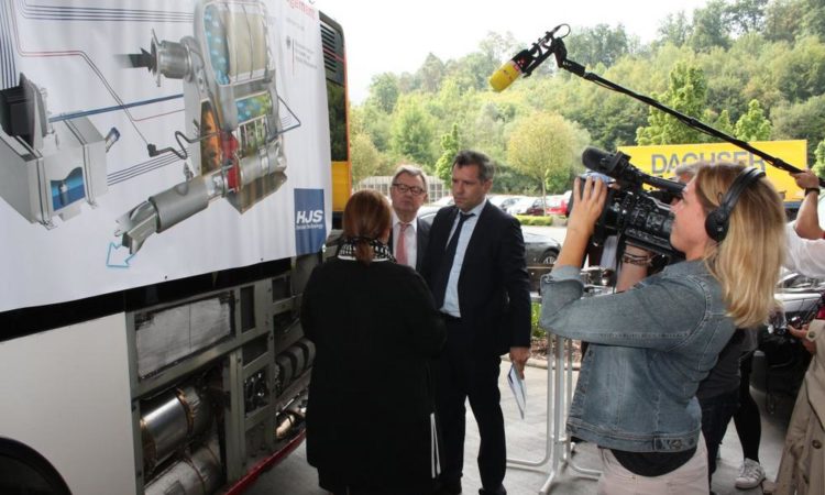 Der Firmeninhaber Hermann-Josef Schulte erläuterte den entscheidenden Einfluss einer ausreichend hohen Abgastemperatur auf die Stickoxidreduzierung mit Abgasnachbehandlungssystemen. „Insbesondere beim langsamen Stopp and Go Verkehr in der Innenstadt sinkt die Temperatur im Katalysator auf Werte kleiner 200°C, die AdBlue® Dosierung muss ggf. abgeschaltet werden und die schädlichen Stickoxide werden nicht reduziert. Hier schalten wir unser aktives Thermomanagement ein und erhöhen die Temperaturen so, dass unter allen Randbedingungen die Stickoxide um mehr als 85 % reduziert werden.“
