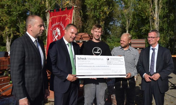 Der Meisterbonus wurde auf Vorschlag der brandenburgischen Handwerkskammern in unserem Land eingeführt. Jeder Brandenburger, der seit dem 1. April erfolgreich seine Aufstiegsfortbildung zum Handwerksmeister im Land abgeschlossen hat, kann eine Anerkennungsprämie von 1.500 Euro erhalten und den Antrag auf Gewährung bei den Handwerkskammern stellen. Die Abwicklung sichern die Handwerkskammern vor Ort kostenfrei. Meisterabsolventen werden damit für ihre hohe Weiterbildungsbereitschaft gewürdigt.