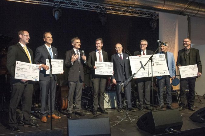 Foto (v. li.): Bernd Riedel (Main-Post) als Vertreter des Vereins Aktion Patenkind e.V., Prof. Dr. Frank Schiefelbein (Uniklinikum Würzburg) als Mitinitiator des Prostata Hilfe Deutschland e.V., Claus Bolza-Schünemann (Koenig & Bauer), Christian Schuchardt (Oberbürgermeister Würzburg) für das Projekt barrierefreies Integrationscafe auf dem ehemaligen LGS-Gelände, Dr. Klaus Mapara (Robert Krick Verlag), David Brandstätter (Main-Post), Dr. Gunther Schunk (Vogel Communications Group) und Prof. Dr. Heinz Reinders für die Heuchelhof Dragons. (Foto: Katrin Heyer)