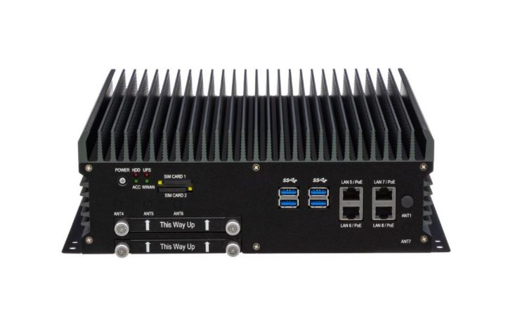 Auf dem passiv gekühlten Gehäuse mit den Maßen 260 x 226 x 89 Millimeter ist Platz für zahlreiche Anschlüsse. Auf dem Frontpanel befinden sich vier USB-3.0-Anschlüsse sowie vier LAN-Schnittstellen für den Anschluss externer Peripherie. Neben zwei SIM-Card-Slots finden sich hier auch der Power-Button und einige Kontrolllampen, unter anderem für die HDD. Auf dem Backpanel sind vier weitere LAN-Schnittstellen sowie drei COM-Anschlüsse vorhanden. Zudem finden hier vier DisplayPorts ihren Platz, die die Wiedergabe von Multimediainhalten mit einer Auflösung von viermal 4K@60Hz ermöglichen. Ergänzt wird dies von drei Audio-Anschlüssen, die die Bereiche MIC IN, LINE OUT sowie LINE IN abdecken.
