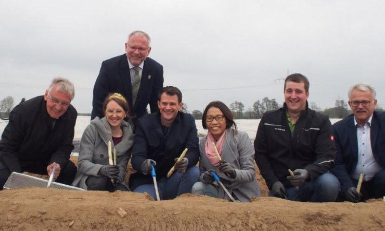 Wie alle Preisträger zuvor, hieß es auch für Henke und Eckhardt erst einmal fest zupacken. Auf einem Feld des Martinshofs, wenige hundert Meter vom Hof entfernt in Richtung Speyer gelegen, musste er unter dem kritischen Blick des Spargelerzeugers Tim Ballreich zeigen, wie man die köstlichen weißen Stangen fachgerecht aus der Erde holt. Unterstützt wurde er dabei unter anderem von der Pfälzischen Weinkönigin Meike Klohr sowie vielen Prominenten aus der Pfälzer Kommunalpolitik. Für das anschließende Spargelmenü mit mehr als 60 geladenen Gästen zeichnet Stefan Klinck vom „Felschbachhof“ in Ulmet im Kreis Kusel verantwortlich. Klinck servierte als Hauptgericht nach einem Rezept von Sarah Henke Entenbrust „sous vide“ gegart, dazu Pfälzer Spargel mit Kimchi Marinade, Miso Espuma und kleinen Kartoffeln.