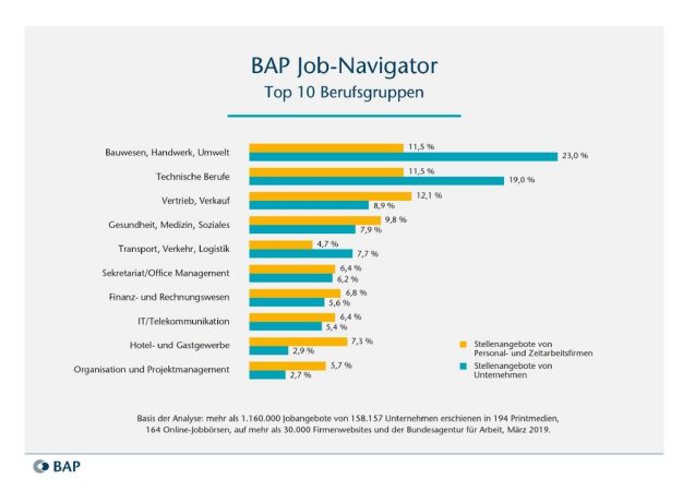 Der BAP Job-Navigator wertet monatlich die Stellenangebote aus 194 Printmedien, 164 Online Jobbörsen, mehr als 30.000 Firmenwebsites und der Jobbörse der Bundesagentur für Arbeit aus. Im Zeitraum März 2019 wurden insgesamt mehr als 1.163.010 Stellenanzeigen von über 158.000 Unternehmen analysiert. Wenn mehrere Anzeigen für eine Stelle geschaltet wurden, werden diese zusammengefasst und nicht mehrfach gezählt.