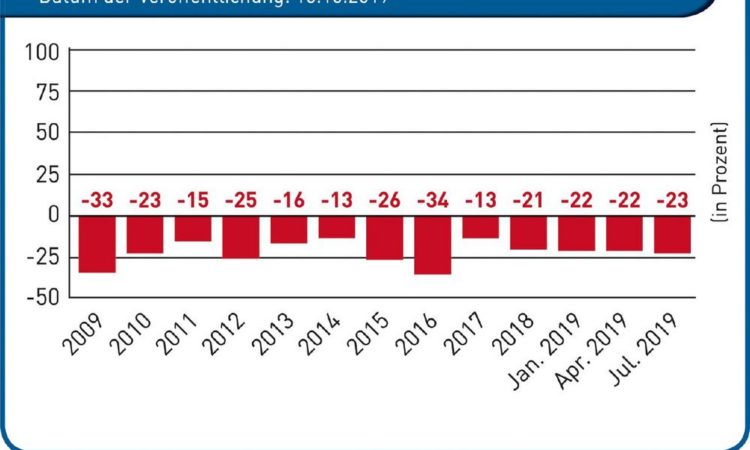Der Milch Marker Index liegt im Juli 2019 bei 107. Im Vergleich zum April 2019 gingen die Milcherzeugungskosten nur geringfügig um 0,05 Cent auf 44,28 Cent zurück. Damit halten sich die Kosten bereits seit über sieben Monaten über 44 Cent je kg erzeugter Milch. Trotz des leichten Rückgangs verschlechterte sich die Preis-Kosten-Ratio aber erneut. Die Milchauszahlungspreise waren im selben Quartal durchschnittlich um weitere 0,57 Cent auf 33,99 Cent gesunken. Im Juli 2019 betrug die Unterdeckung 23 Prozent! Gegenüber dem relativ erträglichen Preisjahr 2017 ist die Unterdeckung sogar um zehn Prozent angestiegen.