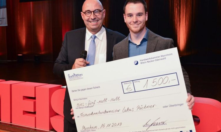 In der diesjährigen Meisterprüfung war er Prüfungsbester im Feinwerkmechaniker-Handwerk und erzielte mit der Durchschnittspunktzahl von 85,5 Punkten die Note 2,0. Hervorzuheben sei, dass er im Teil I der Meisterprüfung beeindruckende 94 Punkte erzielen konnte. Gerade diese Leistung sei bemerkenswert. Damit könne man gerade in diesem Handwerk von einer hervorragenden Leistung sprechen. Die sehr gute Leistung im Teil I der Meisterprüfung, also dem „Meisterprüfungsprojekt“, so Schillinger, zeichne ihn als sehr guten Handwerker aus. Michael Schillinger gratulierte dem jungen Feinwerkmechanikermeister ganz herzlich und forderte ihn auf, sich auf dem Weg in die Zukunft „sattelfest“ zu machen.