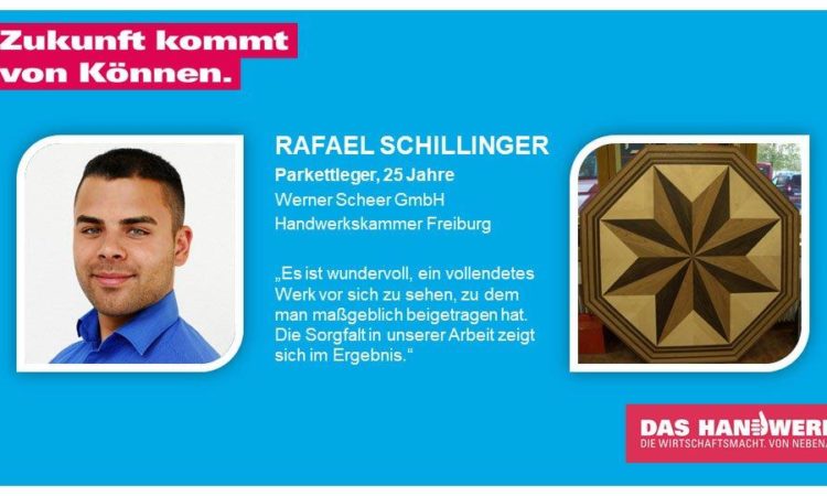 Ein 1. Preisträger im Wettbewerb „Die gute Form im Handwerk – Handwerker gestalten“ kommt aus Südbaden. Rafael Schillinger aus Ringsheim setzte sich deutschlandweit in seinem Beruf durch. Der Parkettleger hat seine Ausbildung bei der Werner Scheer GmbH in Freiamt absolviert. Ziel des Wettbewerbs ist es, insbesondere die gestalterischen Fähigkeiten junger Fachkräfte und die ästhetische Qualität ihrer Arbeiten zu würdigen.