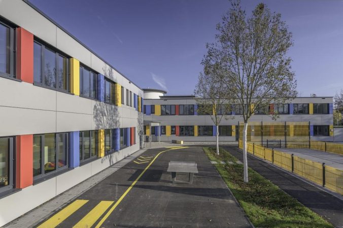 Sollte die Schülerzahl in den kommenden Jahren steigen und sich abzeichnen, dass weitere Räume benötigt werden, ist die Aufstockung des Modulgebäudes innerhalb kurzer Zeit möglich. Die Heizung wurde bereits im Vorfeld so konzipiert, dass ein weiteres Geschoss mitversorgt werden kann. Aufgrund dessen, dass die Luft-Wasser Wärmepumpe des Gebäudes mit einem Gasbrennwertkessel gekoppelt ist, wird 8 % mehr Wärmeenergie aus dem gelieferten Erdgas extrahiert. Farbige Blindelemente akzentuieren die sonst grauen HPL-Platten der Fassade und schaffen ein abwechslungsreiches und attraktives Erscheinungsbild.