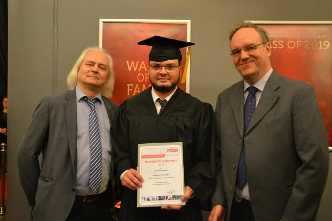 Die Laudatio auf Andreas Federl hielt Xaver Huber, Personalvorstand der Zollner Elektronik AG als Vertreter des Stifters. Einer der ersten Gratulanten war der Professor für Angewandte Informatik, Dr. Robert Bösnecker, Betreuer der Masterarbeit auf Seiten der THD. Der frühere Abteilungsleiter in der Hardware-Entwicklung bei Siemens freute sich sichtlich über den Erfolg seines Schützlings.