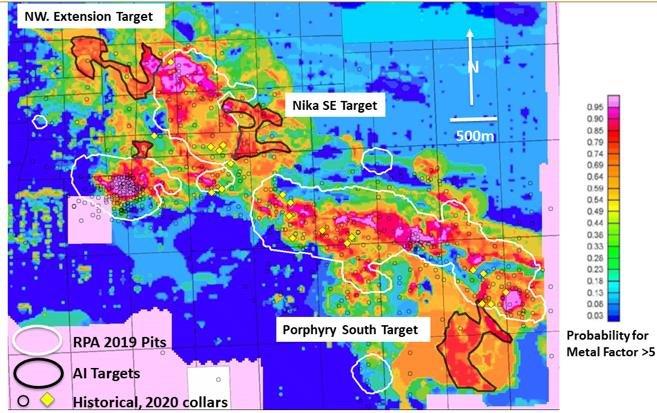 Die Studie von 2008 wurde von Diagnos Inc. abgeschlossen und umfasste eine Fläche von etwa 50 km², die sich über das heutige Ressourcengebiet hinaus um etwa 7 km nach Nordwesten erstreckt, ohne jedoch die 531 und die Hauptzonen abzudecken. Der verwendete Datensatz umfasste 67.836 Proben aus 505 Bohrlöchern sowie geophysikalische, lithologische, geochemische und Alterungsdaten, wobei insgesamt 21 Variablen berücksichtigt wurden. Maple Gold importierte eine der daraus resultierenden Prospektivitätskarten in die GIS-Kompilation des Unternehmens, um die in dieser Arbeit definierten Gebiete mit höherem Potenzial mit denen zu vergleichen, die mit der traditionellen Datenschichtung im GIS umrissen wurden. Die Ergebnisse dieser Übung waren ziemlich überzeugend, wobei die historischen KI-Arbeiten das Potenzial für zusätzliche Mineralisierungszonen innerhalb und jenseits der heutigen Zone Nika und noch stärkere Hinweise aus der Vorhersagemodellierung für eine hochgradige Goldmineralisierung jenseits der aktuellen konzeptuellen Gruben, vor allem im NW der Zone NW, bestätigten und auch ein großes, im Wesentlichen nicht gebohrtes Ziel südlich der Zone Porphyr skizzierten (siehe schraffiertes Gebiet in Abbildung 1 unten).