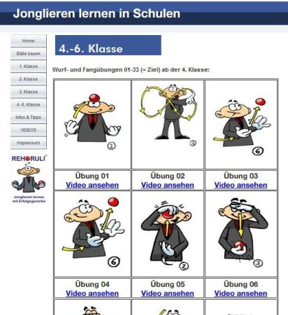 Für das Jonglieren-Lernen benötigt man im Wesentlichen drei Jonglierbälle und eine gute Jonglieranleitung. Die wenigsten haben Jonglierbälle zu Hause, aber für den Anfang genügen drei Paar Socken, die man fest und möglichst rund zusammenrollt. Wer 9-12 handelsübliche Luftballons zu Hause hat, kann jeweils 3-4 davon für einen Jonglierball einsetzen. Hierzu kann man z.B. Reis, Vogelfutter oder Katzenstreu als Füllung nutzen (mind. 90g je Ball). Wie der Reis bzw. eine andere Füllung über eine PET-Flasche in den Luftballon gelangt und wie man 2-3 weitere Luftballons überstülpt, ist in einem kostenfreien Video auf der Webseite http://www.jonglierschule.de/… zu sehen. Wenn man Jonglierbälle mit Socken oder Luftballons und Füllung „gebaut“ hat, kann man schon loslegen, wenn man über W-LAN im Haus verfügt. Ebenfalls auf der Webseite http://www.jonglierschule.de/… ist das komplette Jonglier-Lernsystem REHORULI® (Video-Tutorials) kostenfrei abrufbar. REHORULI® ist Deutschlands meistverkauftes Jonglier-Lernsystem und verfügt über insgesamt 34 Übungen. Auf der Webseite sind diese Übungen unterteilt für 1. Klasse, 2. Klasse, 3. Klasse und ab. 4. Klasse, so dass auch Kinder/Schüler unter 10 Jahre mit 1- und 2-Ballübungen aktiv ihr Gehirn trainieren können.