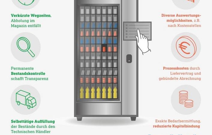 Für die optimale Materialversorgung setzt der Technische Handel auf ganzheitliche, modular aufgebaute technische Lösungen. Diese berücksichtigen den Produktbedarf sowie alle Beschaffungs- und Ausgabewege des Kunden vollständig. Mit ihrer Hilfe stehen dem Kunden sämtliche Hilfs- und Betriebsstoffe rund um die Uhr zur Verfügung –unabhängig von den Öffnungszeiten der Materialausgabe durch die Mitarbeiter. Ein wichtiger Baustein dieser Systeme sind die „smarten Ausgabeautomaten“. Um den unterschiedlichen Anforderungen der Unternehmen gerecht zu werden, sind diese Automatenmodelle in einer Vielzahl an Varianten verfügbar. Der Kunde kann dabei zwischen Klappen-, Spiral-, Rotations- oder Schubladenautomaten wählen. Je nach Lösung können viele Hundert Produkteinheiten zugriffsgesichert ausgegeben werden. Zur rechtzeitigen Wiederbefüllung erhält der Technische Händler eine digitale Bestandsmeldung.  Die Breite der personellen, logistischen und finanziellen Vorteile haben Experten im VTH Verband Technischer Handel e.V. in der Infografik „10 Vorteile von Ausgabeautomaten als Teil eines strukturierten Versorgungssystems“ aufbereitet.
