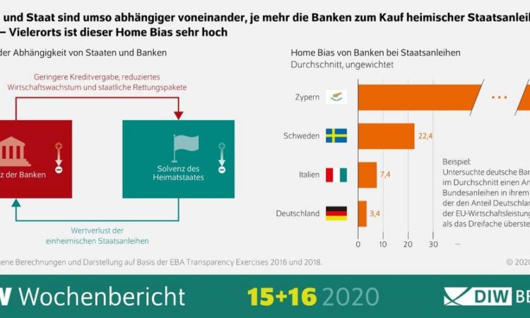 Wenn Staaten und Banken zu abhängig voneinander sind, leidet die Stabilität des gesamten Finanzsystems. Das war eine Lehre aus der Finanz- und Staatsschuldenkrise im Euroraum, die vor gut zehn Jahren begann. Wie eine neue Studie des Deutschen Instituts für Wirtschaftsforschung (DIW Berlin) zeigt, ist es jedoch noch immer nicht gelungen, die ungünstige Verbindung von Banken und Staaten zu reduzieren: Viele europäische Banken tendieren nach wie vor dazu, vorwiegend ihrem Heimatland Geld zu leihen, sprich dessen Staatsanleihen zu kaufen.
