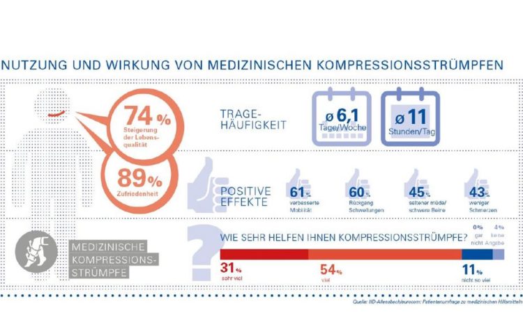 Die hohe Relevanz medizinischer Kompressionsstrümpfe für den therapeutischen Erfolg belegt das Institut für Demoskopie Allensbach mit einer repräsentativen Patientenbefragung. 89 Prozent der Betroffenen sind hochzufrieden mit ihrer Kompressionsversorgung, weil ihre Beschwerden gelindert werden und sie dadurch ihren Alltag wieder besser bewältigen können. Bei 60 Prozent der Patienten gehen Schwellungen zurück,