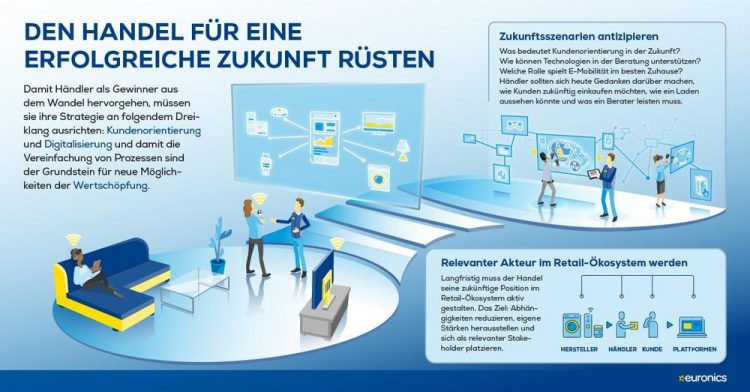 Seit 50 Jahren ist der international agierende Elektronikhändler Euronics auf dem Markt Zuhause, doch die Digitalisierung hat auch im Handel Einzug gehalten und bestehende Strukturen ins Wanken gebracht. Damit Händler auch die nächsten 50 Jahre als Gewinner aus dem Wandel hervorgehen, hat Euronics neue Strategien ins Leben gerufen. Um diese anschaulich und ansprechend zu vermitteln, wurde die Berliner Infografikagentur INFOGRAFIK PRO mit der Gestaltung einer Pressegrafik beauftragt. Das Ergebnis überzeugt sowohl mit qualitativ hochwertigen Illustrationen als auch mit inhaltlicher Dichte. Anwendung findet die Grafik in der internen und externen Kommunikation, in Mailings an Mitglieder, sowie auch als Post in sozialen Netzwerken. Um eine problemlose Verbreitung auf LinkedIn zu garantieren, wurde dafür zusätzlich eine angepasste Variante der Grafik erstellt. „Themen wie Zukunftsstrategien können oft trocken oder sogar einschüchternd wirken. Ich finde, wir es haben mit unserer Grafik geschafft eine positive und interessante Form der Vermittlung zu finden, die gleichzeitig der Thematik gerecht wird.“, sagt Jonas Evertz, Senior Designer bei INFOGRAFIK PRO.