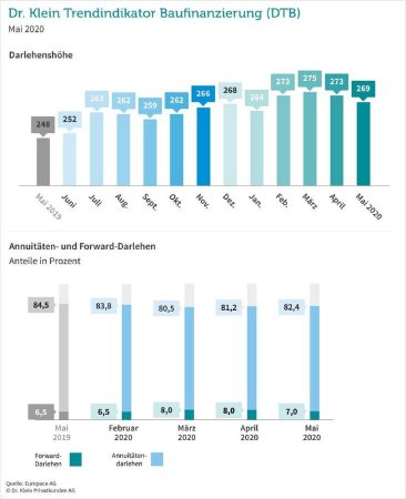 Der Wohnimmobilienmarkt zeigt sich relativ unbeeindruckt von der Pandemie: Laut Trendindikator Immobilienpreise von Dr. Klein lässt lediglich die Dynamik, mit der die Immobilienpreise steigen, in einigen Regionen nach – aber nicht die Preise selbst. Folglich bleibt auch die Darlehenssumme im Mai mit rund 269.000 Euro auf einem hohen Niveau. Aber: Dieser Wert sinkt im zweiten Monat in Folge, im März betrug die durchschnittliche Summe noch 275.000 Euro.