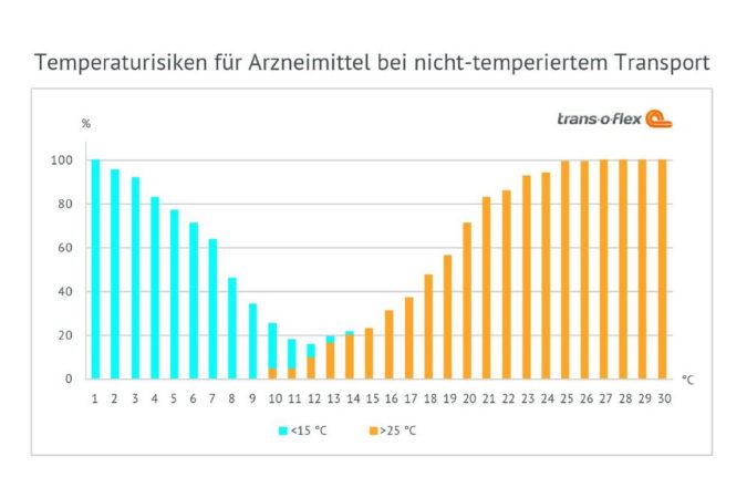 Wer die Temperatur, bei denen Arzneimittel transportiert werden, nicht überwacht und steuert, der geht in Deutschland an jedem Tag des Jahres das Risiko ein, dass ein Medikament beim Transport an Wirksamkeit verliert. Warum das so ist und wie hoch das Risiko ist, das hat der auf den Transport pharmazeutischer und anderer sensibler Produkte spezialisierte Logistikdienstleister trans-o-flex in mehreren bundesweiten Testreihen erhoben. Das Ergebnis seiner Auswertung stellt das Unternehmen täglich in Bezug zu den aktuellen Tagestemperaturen auf seiner Website dar. „Egal zu welcher Tageszeit und egal, ob im Sommer oder im Winter transportiert wird: Unsere Messungen haben gezeigt, dass es keine Außentemperatur gibt, bei der Arzneimittel auch ohne Temperierung risikolos den Raumtemperaturbereich von 15 bis 25 Grad einhalten“, sagt Wolfgang P. Albeck, CEO von trans-o-flex, bei der Vorstellung der Testergebnisse in Weinheim. Das geringste Risiko liegt bei einer Außentemperatur von 12 Grad. Hier liegt die Wahrscheinlichkeit, dass eine Sendung bei der Auslieferung in einem untemperierten Fahrzeug bei unter 15 oder über 25 Grad Celsius befördert wird, bei 16 Prozent. Oberhalb und unterhalb dieser Temperatur steigt das Risiko sprunghaft an (siehe Grafik).