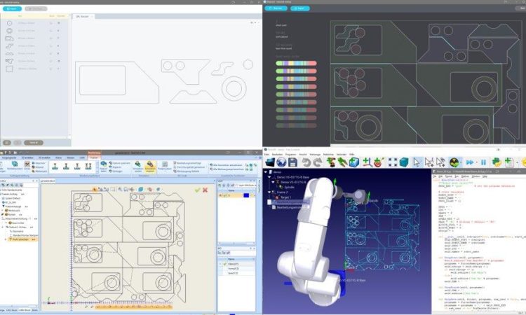 BobCAD-CAM, Deepnest und RoboDK unterstützen den Anwender durch leistungsstarke Funktionen für die kostengünstige Erstellung von NC-Programmen und die Simulation von Roboterbewegungen beim Einsatz von Industrierobotern in der modernen Fertigung. Mit BobCAD-CAM werden CAD-Modelle entworfen, mit BobCAD-FreeCAD sogar kostenlos. Die konstruierten Teile können anschließend zum Verschachteln an Deepnest übergeben werden. Der hier erstellte, optimierte Schachtelplan geht zurück an BobCAD-CAM, wo die entsprechenden CNC-Programme für die gewünschte Fertigungsart generiert werden. Nach Übergabe der NC-Daten an RoboDK werden diese in Roboterprogramme konvertiert und es erfolgt die Berechnung und Simulation der Roboterbewegungen.