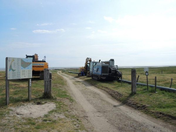 Die heikelste der HDD-Bohrungen nahm das achtköpfige Team in den ersten Junitagen als letztes in Angriff: die Anlandungsbohrung d.h. die Verlegung des Leerohres DA 355 mm zur Aufnahme des Seekabels im Watt bis zum Muffenschacht. Hier war besondere Umsicht und präzises Timing geboten. Die Gezeiten ließen das Arbeiten nur innerhalb bestimmter Zeitfenster zu und das Watt durfte in Teilen garnicht betreten oder durch Fahrzeuge belastet werden. Die 150 m lange Pilotbohrung klappte reibungslos, doch beim Rohreinzug versank der Wattbagger, der das schwere PE-Rohr halten sollte, in dem weichen Untergrund und die Arbeiten mussten einige Zeit pausieren werden. Die Aufgabe des Wattbaggers übernahm später ein Tauchschiff, mit dessen Hilfe das 355mm-Rohr schließlich eingezogen wurde.