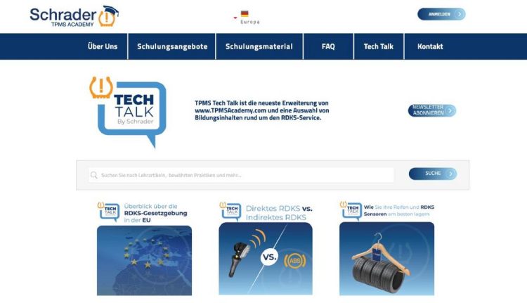 TPMS Tech Talk ist ein Online-Portal, das auf der Website www.TPMSAcademy.com zu finden ist. Das Ziel des TPMS Tech Talk sind: die RDKS-Experten von Schrader und Servicefachleute zusammenzubringen, zuverlässige Informationen zu bieten und ein offenes Gespräch zu initiieren. Die Themen des Tech Talk stammen aus den Herausforderungen bei der Arbeit mit RDKS und den häufigsten Fragen, die das technische Team von Schrader erhält, wie z. B.: Gespräche mit Kunden über RDKS, die Bedeutung von Wartungs- und Software-Updates des RDKS-Programmiergeräts, Unterschiede zwischen Programmier- und Anlernverfahren, die RDKS-Gesetzgebung, usw. Der Inhalt wird häufig aktualisiert und Besucher können sich kostenlos anmelden, um Nachrichten zu erhalten. Die Benutzer werden ermutigt, sich mit dem technischen Team von Schrader sowie mit den Kollegen unter jedem Artikel im Kommentarfeld in Verbindung zu setzen.
