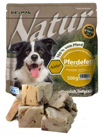 Die gewünschte Menge Pferdefett (ca. 10 % des Fleischanteils) in die Tagesportion zu füttern. Die Stücke portioniert und nach dem Auftauen einfach ins Fressen zu mischen.