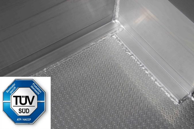 Alu-Sockel und Alu-Boden werden an allen Kanten rundum verschweißt. Die flüssigkeitsdichte Bodenwanne ist stabil und langlebig und kann täglich mit dem Hochdruckreiniger gereinigt werden.