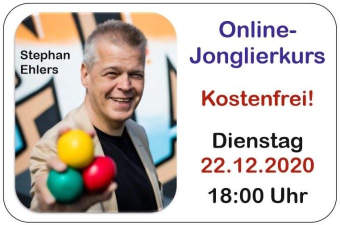 Während der Corona-Zeit bietet die Jonglierschule München am 22. Dezember 2020 und 15. Januar 2021 jeweils um 18 Uhr einen kostenfreien Online-Jonglierkurs an. Kinder (ab 10 Jahre) und Erwachsene erhalten kostenfrei die Gelegenheit, von Stephan Ehlers – Deutschlands erfolgreichstem Jongliertrainer – in die Kunst der 3-Ball-Jonglage eingewiesen zu werden. Der Veranstalter versichert: "In diesem Kurs werden absolute Anfänger in verblüffend kurzer Zeit erste Erfolge  für die Dreiball-Jonglage erlernen. Es werden auch konkrete Tipps sowie kostenfreie Web-Lernprogramme und App-Links genannt, wie man dann zu Hause sicher weiter üben kann. Es sind keinerlei Vorkenntnisse erforderlich und ja, es ist völlig kostenfrei!". Die Vorab-Registrierung hat bereits begonnen. Jede/r der mindestens 10 Jahre alt ist, kann kostenfrei mitmachen.