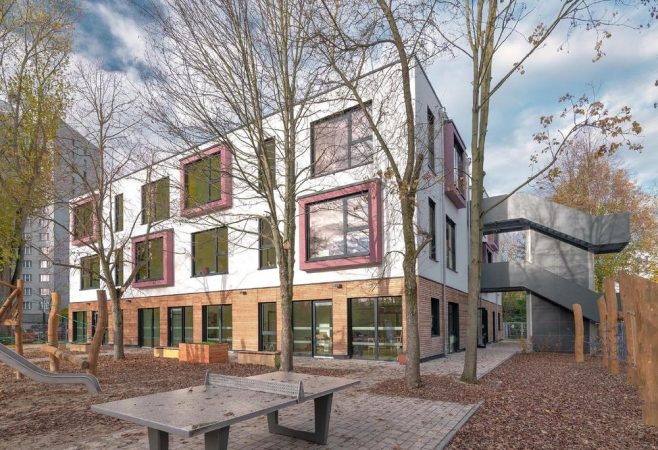 Da das bisherige Betreuungsangebot in Potsdam nicht mehr der Bedarfssituation entsprach, musste die Landeshauptstadt handeln und schnellstmöglich weitere Kita- und Hortplätze schaffen. Um die Aufgabe im geforderten Zeitrahmen zu meistern, entschloss sich der Kommunale Immobilien Service (KIS) als Bauherr, unter Hinzunahme des in diesem Bereich bereits erfahrenen Planungsbüros LEITPLAN, für die modulare Bauweise. Hauptgrund für diese Wahl: Durch im Werk vorgefertigte Raumeinheiten verkürzt sich die Zeit auf der Baustelle um ein Wesentliches. Innerhalb weniger Tage entsteht ein geschlossener Baukörper; Witterungseinflüsse beeinträchtigen den Bauablauf nicht, wie es bei konventionell errichteten Gebäuden häufig der Fall ist. Im Rahmen einer Ausschreibung erhielt KLEUSBERG den Zuschlag für das 3-geschossiges Hortgebäude, in dem Kinder im Alter zwischen 8-12 Jahren betreut werden. Eine logistische Herausforderung für alle Baubeteiligten stellte der zeitgleiche Umbau einer Bestandskita auf demselben Grundstück dar. Dank der guten Abstimmung zwischen Planer, Bauherr und KLEUSBERG konnte der Bauverlauf nach Plan erfolgen und der Hort zum vereinbarten Zeitpunkt fertiggestellt werden.