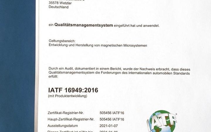 Trotz der Corona-bedingten Möglichkeit zur Verlängerung der Gültigkeit der alten IATF-Zertifikate um sechs Monate und der Verlagerung des Hauptstandorts von Lahnau nach Wetzlar im Sommer 2020 wurde die Rezertifizierung vor Ablauf des standardmäßigen Zertifizierungszyklus von drei Jahren und entsprechend dem ursprünglichen Zeitplan umgesetzt. Damit hat Sensitec sich einmal mehr als kompetenter und verlässlicher Partner der Automobilindustrie positioniert. Aber auch viele andere Branchen können von der Zertifizierung und den damit einhergehenden hohen Standards bei der Produktion der magnetoresistiven Sensoren an den Standorten Mainz und Wetzlar zukünftig profitieren. Mit dem neuen Zertifikat sichert Sensitec seinen Kunden weiterhin eine hohe Prozessqualität und -stabilität zu.