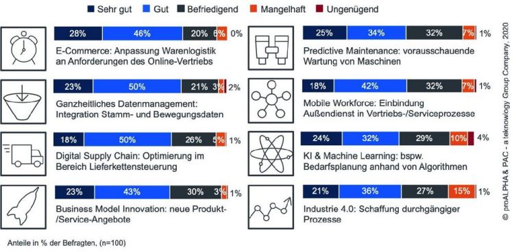 Interessanterweise erhalten ERP-Systeme von ihren Anwendern positive Bewertungen bezüglich denjenigen Themen, die Pandemie-bedingt von besonderer Relevanz sind. So äußern drei Viertel der Befragten (74 %), dass sie in der Transformation ihrer Warenlogistik gute oder sehr gute Hilfestellung durch ihr ERP erhalten. Gleiches gilt für die Optimierung der Lieferkettensteuerung (68 %), die mit Blick auf eventuelle Produktionsausfälle zunehmend gefordert ist.