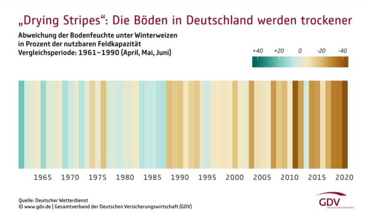 „Wir müssen uns auf die Zunahme von Wetterextremen wie längere Trockenheit und punktuelle Starkregen einstellen“, sagt Wolfgang Janssen, Leiter der Agrarmeteorologie beim DWD. Beides sind Begleiterscheinungen der steigenden Temperaturen in Deutschland, wie auch die Grafik der sogenannten „Warming Stripes“ verdeutlicht. Neun der zehn wärmsten Jahre seit Beginn der Messungen fallen in die Zeit nach der Jahrtausendwende. Die letzten drei Jahre gehören laut DWD zu den acht extremsten – viel zu warm und viel zu niederschlagsarm.