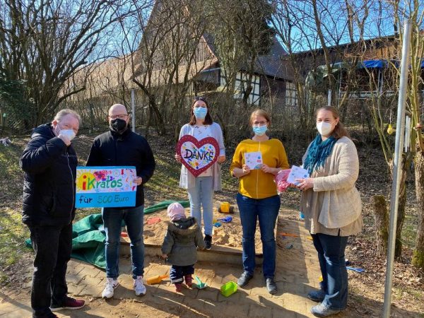Die Kindertagesstättenleitung, Frau Christine Becke (2. von rechts) und Frau Melanie Neuner (Mitte), wird für den Spendenbetrag neue Spielgeräte zum Toben und Kuscheln anschaffen, um Kinderträume zu erfüllen. Dem Geschäftsführer von iKratos, Willi Harhammer (1. von links), liegt die KiTa in der Nachbarschaft sehr am Herzen. Die Spendenübergabe – bei Sonnenschein – fühlte sich für Tobias Harhammer (2. von links) wie eine Reise in die Vergangenheit an, da er selbst als Kind bereits in diesem Sandkasten spielte. Die Kinder haben für die Spender ein kreatives Dankeschön gemalt und gebastelt, welches einen Ehrenplatz in den Geschäftsräumen in Weißenohe erhält. Frau Simone Ellinger (1. von rechts) ist als PR-Beauftragte und Kindergartenbetreuerin ebenfalls hoch erfreut über die große finanzielle Unterstützung für die Neuanschaffungen.