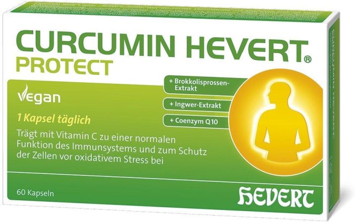 Curcumin Hevert Protect ist als Packung mit 60 Kapseln (PZN: 16230794) in der Apotheke erhältlich.