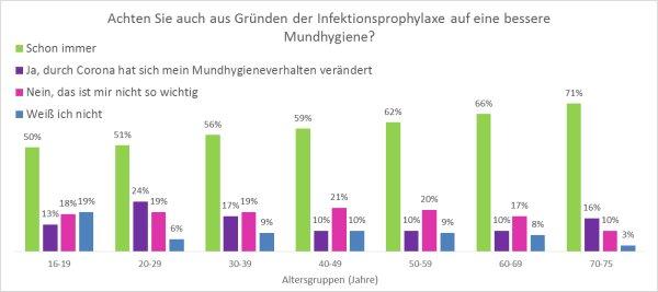 - Insgesamt achten 59 Prozent schon immer auf eine gute Mundhygiene aus Gründen der Infektionsprophylaxe. Insbesondere die Altersgruppe der 60- bis 75-Jährigen liegt hier weit vorne.