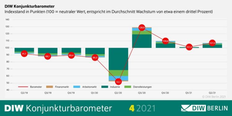 Die Industrie legt indes kräftig zu. „Die boomende Auslandsnachfrage beflügelt die Produktion, und die Durststrecke in der Kfz-Industrie dürfte nach und nach überwunden werden“, sagt Simon Junker, DIW-Experte für die Konjunktur in Deutschland. Vor allem fehlende Bauteile dürften dort noch vorübergehend hemmen. Jüngste Umfragen deuten darauf hin, dass die Lage zwar angespannt bleibt, sich aber allmählich bessert.