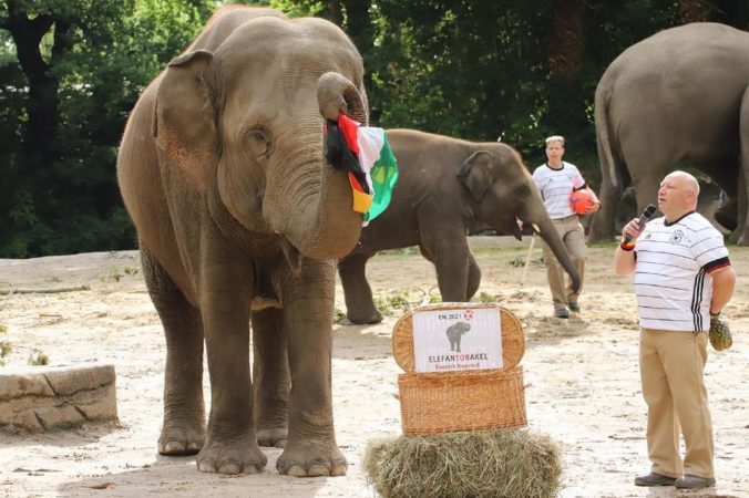 Jungbulle Raj zeigte sich von Beginn an bei bester Laune und kickte fröhlich ein paar Bälle, bis die weise Elefantendame zur Tat schreiten durfte. Fast schon ungeduldig wartete sie auf den Weidenkorb, aus dem sie zielsicher sowohl die deutsche als auch die ungarische Fahne rüsselte.