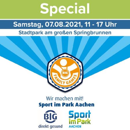Die BIG ist nicht nur Gesundheitspartner von Sport im Park Aachen, sondern bringt sich auch selber aktiv in das Sportangebot ein. Im Aachener Stadtpark finden zum ersten Mal die BIG Family Games statt: deshalb unbedingt den 7. August (Samstag), von 11 bis 17 Uhr, vormerken! Dann machen Aachener Familien das Spaß-Sport-Abzeichen in unmittelbarer Nähe zum Eurogress, der an den Stadtpark angrenzt. Direkt am Eurogress Aachen befindet sich ein Parkhaus, das über die Monheimsallee in 52062 Aachen zu erreichen ist.