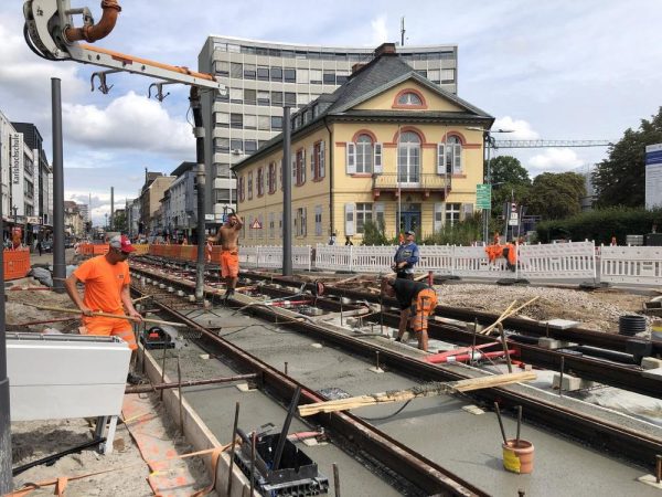 Weiter geht es an dieser von Autos, Radlern und Fußgängern hochfrequentierten Kreuzung dann auch noch in dieser Zeit mit dem Schienenbau: Gleise werden über das Ettlinger Tor verlegt, westlich vom Ettlinger Tor beginnt dann auch der Bau der dritten der insgesamt drei neuen Oberflächen-Haltestellen in der Kriegsstraße.
