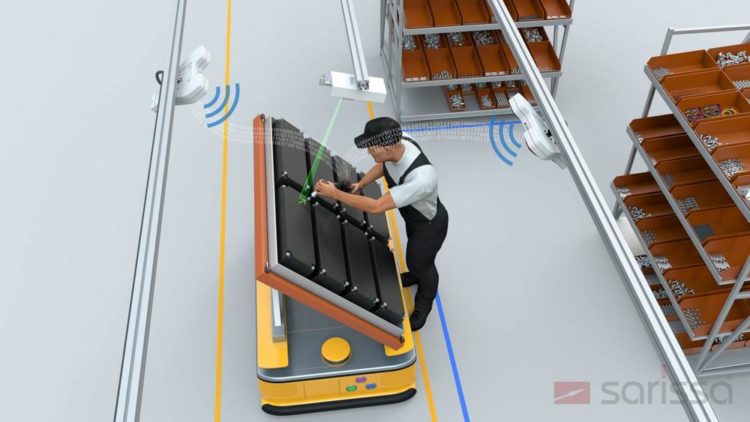 Durch einen Datenaustausch zwischen dem Transportsystem und dem Sarissa-System ist auch eine markerlose Referenzierung möglich. Es besteht die Möglichkeit, die Ortsinformation aus der Bandsteuerung zu verwenden. Das FTF wird kontinuierlich referenziert. Die Spannungsversorgung für das Sarissa-Referenztag kann dem FTF entnommen werden. Bewegliche Werkstücke in der Fließproduktion können von Empfänger zu Empfänger „weitergereicht“ werden. Bei beweglichen Werkstücken oder mit einem FTF, das an verschiedenen Positionen stoppt, bezieht sich der Sarissa-Werkzeugsender auf ein bewegliches Koordinatensystem und berechnet dessen Position mit höchster Genauigkeit.
