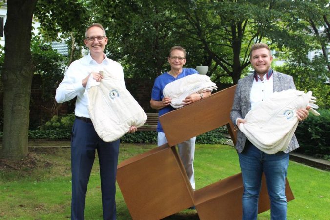 Die Karnevalsgesellschaft setzt sich für die Babyschlafsack-Kampagne ein und spendet: Die Initiative der Krankenhausgesellschaft NRW wird im Marienhospital Brühl aktiv unterstützt. Jedes neugeborene Kind erhält als Geschenk einen Schlafsack, der vor dem plötzlichen Kindstod schützen soll. „Helfen ist für uns eine Selbstverständlichkeit. Deswegen engagieren wir uns dort, wo Unterstützung gebraucht wird“, sagt Andreas Granrath, Präsident des Karnevalvereins, und überreicht Geschäftsführer Jan Patrick Glöckner und Chefarzt Dr. Carl-Michael Schmidt die modernen Babyschlafsäcke.