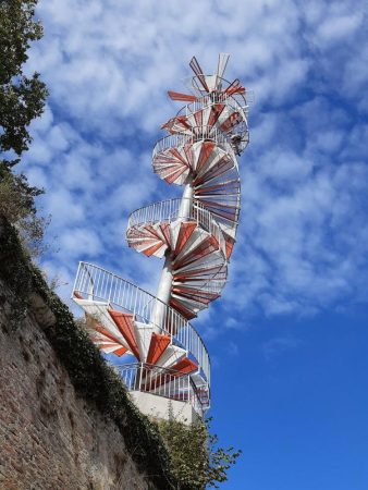 Aufgrund der schlanken und schiefen Bauweise des Turms, war die technische Umsetzung mehr als anspruchsvoll. So wurde beispielsweise, um unzulässiges Aufschwingen der Konstruktion zu vermeiden, ein Schwingungstilger in die Säule eingesetzt. Als Korrosionsschutzsystem kam eine dauerhafte und robuste Feuerverzinkung für sämtliche Stahlteile zum Einsatz. Die Gitterroststufen wurden als Duplex-System ausgeführt, das heißt sie wurden zusätzlich zur Feuerverzinkung aus gestalterischen Gründen pulverbeschichtet.