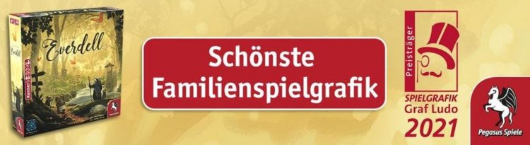 Das optisch wie spielerisch herausragende Everdell, das mit seinen detailreichen und liebevoll gezeichneten Illustrationen zu begeistern weiß, wurde von der Jury als Gewinner in der Kategorie „Schönste Familienspielgrafik“ ausgezeichnet. Ein bis vier Spielende bauen in dem Spiel von James A. Wilson mittels Karten ihre eigene Stadt im friedlichen, bewaldeten Tal von Everdell. Die ansprechenden und fantasievollen Illustrationen von Andrew Bosley untermalen dabei das Spielthema und machen Lust darauf, die tierischen Bewohner des friedlichen Waldtals näher kennenzulernen. Im Herbst/Winter 2021 erscheint die zweite Auflage des Grundspiels. Die 2. Edition der Pearlbrook-Erweiterung sowie zwei neue Erweiterungen, Bellfaire und Spirecrest, erscheinen voraussichtlich in Q1-2022.