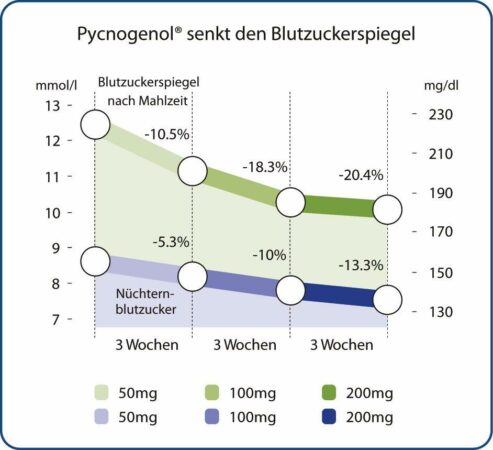 Bei gesunden Menschen mit nur leicht erhöhten Blutzuckerwerten und Diabetes Typ 2 konnte die regelmäßige Einnahme von täglich 50 bis 200 mg Pycnogenol® sicher, effektiv und dosisabhängig den Blutzuckerspiegel senken (siehe Abbildung 1).[3] In einer weiteren Studie wurde die Wirkung von Pycnogenol® auch bei Diabetes-Typ-2-Patienten, die ihre herkömmliche Medikation beibehielten, untersucht. Auch hier konnte die zusätzliche Einnahme des Pflanzenextraktes eine signifikante Senkung der Nüchtern-Blutglukosespiegel erzielen.[4]