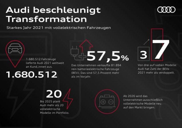 Die Kurve der Auslieferungen vollelektrischer Modelle hingegen zeigt weiter nach oben. 2021 verkaufte Audi 81.894 vollelektrische Modelle – ein Plus von 57,5 Prozent.