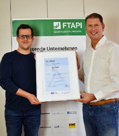 Die offizielle Zertifikatsübergabe fand am 21. Februar 2022 in München statt. Ralph Freude, Head of Businessline ict beim TÜV Rheinland, überreichte das ISO/IEC 27001-Zertifikat an Ari Albertini, Mitglied der Geschäftsleitung der FTAPI Software GmbH. „Als Anbieter von umfassenden Software-Lösungen für alle Aspekte des sicheren Datenaustauschs ist Vertrauen für uns einer der wichtigsten Erfolgsfaktoren. Unsere Kunden verlassen sich darauf, dass unsere Produkte die strengsten Anforderungen an die Informationssicherheit erfüllen“, sagt Ari Albertini. „Das ISO 27001-Zertifikat ist ein weiterer Beleg für unsere Kunden, Partner und auch für unsere Angestellten, dass wir als FTAPI uns voll und ganz der Wahrung der Sicherheit widmen.“