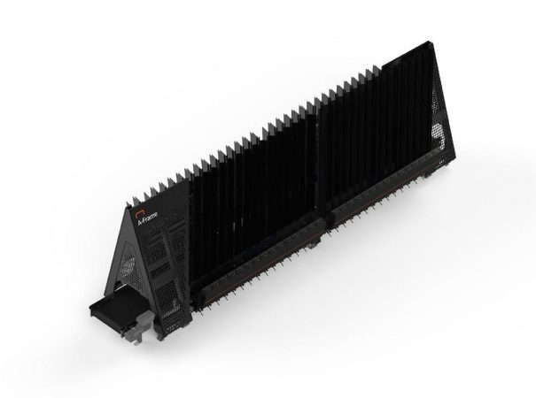 Mit der Live-Vorführung des A-Frames demonstriert die Inther Group mit Stammsitz in Venray bei Venlo auf dem Stuttgarter Messegelände Aufbau und Funktionsweise ihres vollautomatisierten A-Frames. Dabei ist der Name des Gerätes zugleich Programm: Über einem zentralen Förderband laufen von den Seiten jeweils im 45-Grad-Winkel zwei Gravitationsauswerfer zusammen – und bilden eine „A“-Konstruktion. An der Außenseite ist die Anlage je nach Erfordernis flexibel mit zahlreichen nebeneinander liegenden Kanälen zur Einlagerung der Artikel bestückt. Die Maße der Kanalschächte lassen sich mit wenigen Handgriffen flexibel auf die jeweiligen Artikelgrößen zuschneiden.