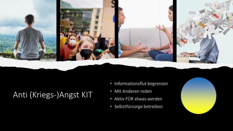 An dieser Stelle kann es nicht darum gehen kluge Pläne zu schmieden, um die russischen Truppen aus der Ukraine zu vertreiben. Diese Aufgabe liegt bei der internationalen Politik und dem tapferen ukrainischen Volk. Das Problem zweiter Ordnung, die Angst, soll nun konstruktiv bekämpft werden, damit man, realistisch besorgt, aber im Vollbesitzt aller seiner rationalen und motivationalen Kräfte, das tun kann, was langfristig den Frieden der Welt und den eigenen Seelenfrieden sichert. Hier ist nun also das Rüstzeug, um mit schädlicher Angst umzugehen und Herausforderungen langfristig zu bestehen: Der Anti-Kriegsangst-KIT gegen die Schockstarre.