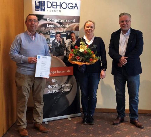 Unmittelbar nach den Wahlen steht für Holger Gries eine erste Aufgabe als Vorsitzender an. Gemeinsam mit DEHOGA-Südhessen-Geschäftsführerin Christine Friedrich überreicht er an Anke und Klaus Kemmler zum 110jährigen Bestehen ihres Appartementhotels Zum Grünen Haag in Mörfelden-Walldorf eine Urkunde des Verbandes zur erfolgreichen Führung eines mittelständischen Familienbetriebes über viele Jahre hinweg. „Das ist eine unternehmerische Leistung mehrerer Generationen, die Anerkennung und Respekt verdient.“